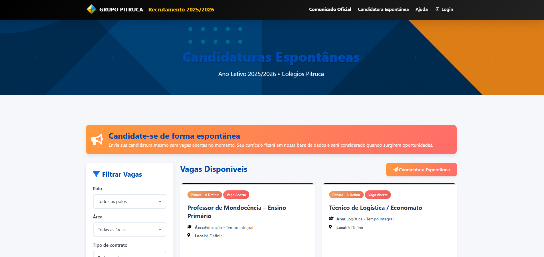 O Grupo Pitruca está sempre em busca de talentos dedicados e apaixonados pela educação. Neste momento, abrimos recrutamento para várias posições em nossos colégios, bem como para candidaturas espontâneas, permitindo que profissionais interessados se juntem à nossa equipa de excelência.